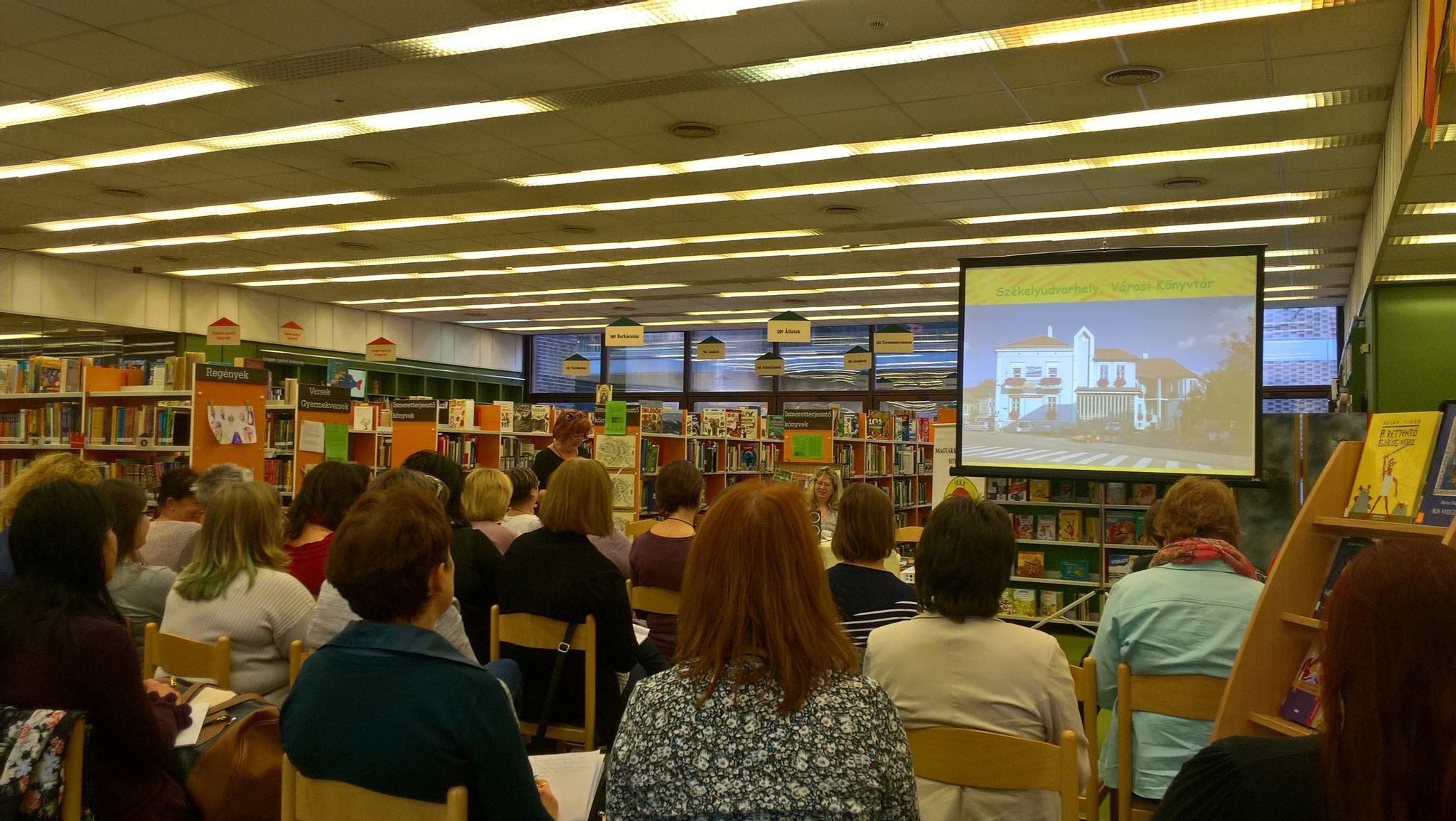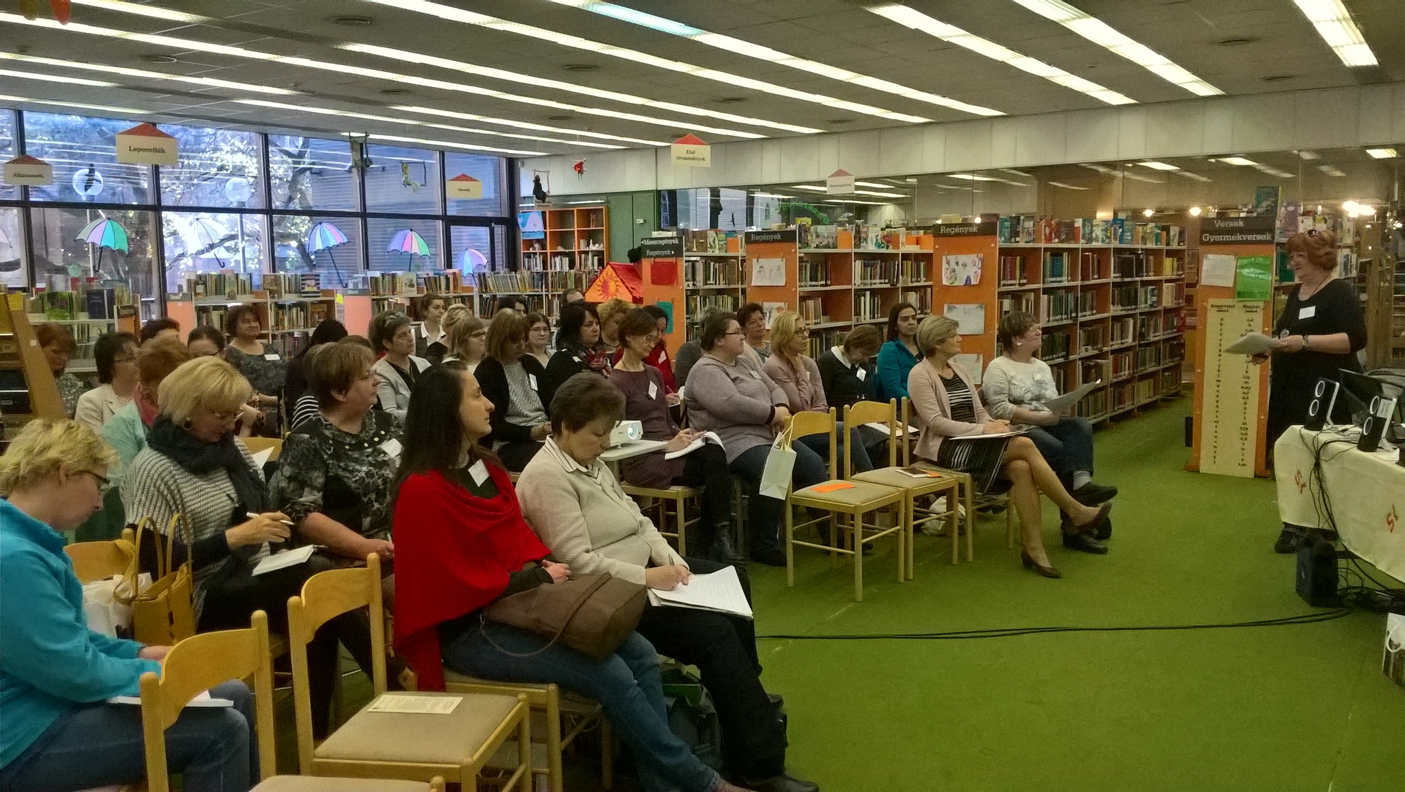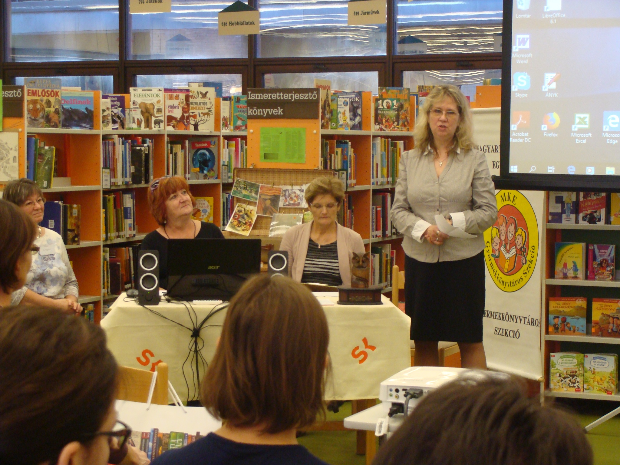 Az üdvözlő szavak után Kucska Zsuzsanna mutatta be a Könyvtári Intézet egyik új akkreditált képzését. A képzésen gyermekkönyvtári ismereteket sajátíthatnak el a kollégák, megismerkedhetnek a legújabb trendekkel, módszerekkel. Zsuzsa nem csak bemutatta a képzést, de már beszámolt az első évfolyam tapasztalatairól, sikereiről is.